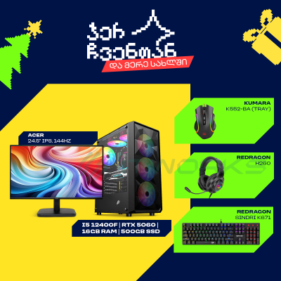 Gaming კომპლექტი I5 12400F | RTX 5060 | 16GB RAM | 24" 144HZ Monitor | Gaming აქსესუარები