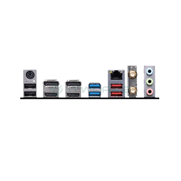 | შემომავალი პორტები უკანა პანელზე | 2x USB 2.0, 1x Keyboard / Mouse Port, 2x HDMI, 2x DP, 2x USB 3.2 Gen 1 5Gbps (Type-A), 2x USB 3.2 Gen 2 10Gbps (Type-A), 1x 2.5G LAN, 2x Wi-Fi / Bluetooth Antennas, 3x Audio Ports |