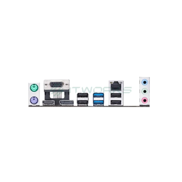 | შემომავალი პორტები უკანა პანელზე | 2x USB 3.2 Gen 1 ports (2 x Type-A) 4x USB 2.0 ports (4 x Type-A) 1x DisplayPort 1x D-Sub port 1x HDMI™ port 1 x Intel® I219-V 1Gb Ethernet port 3 x Audio jacks 1 x PS/2 Keyboard (purple) port 1 x PS/2 Mouse (green) port |
