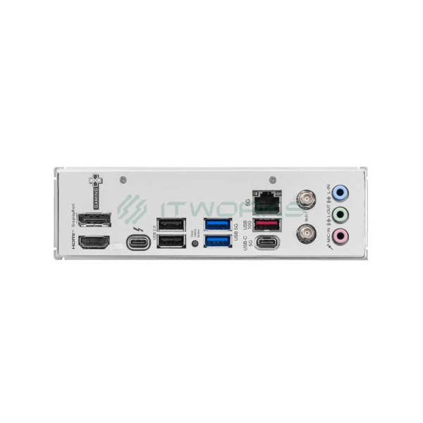 | შემომავალი პორტები უკანა პანელზე | 1x HDMI, 1x DP, 1x Thunderbolt™ 4 40Gbps (Type-C), 1x USB 5Gbps (Type-C), 2x USB 2.0, 2x USB 5Gbps, 1x USB 10Gbps, 1x 5G LAN, 3x Audio Ports, 2x Wi-Fi / Bluetooth Antennas |